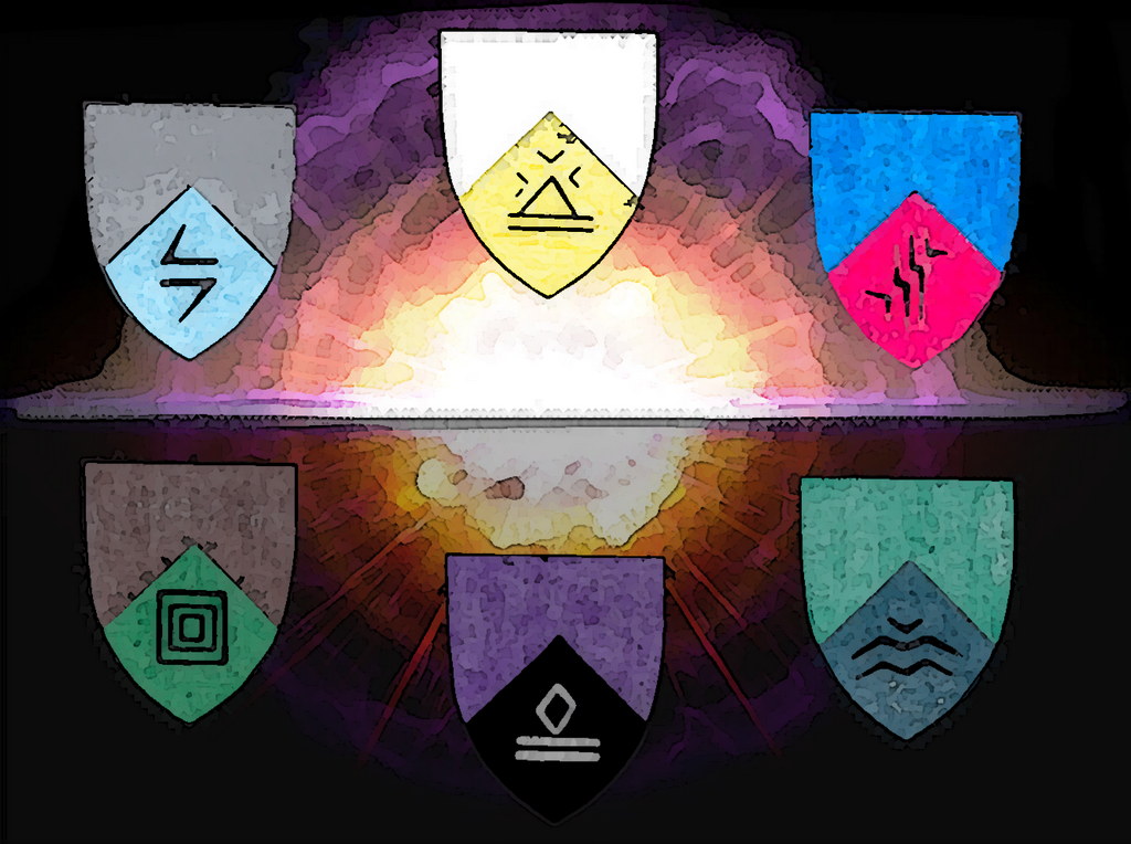 Elemntar-Wappen, oben v.l.n.r.: Luft, Licht, Feuer unten v.l.n.r.: Erde, Dunkelheit, Wasser