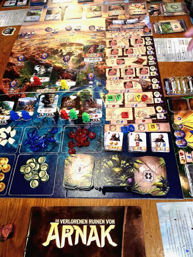 Aber ist das Spiel deswegen schlecht? Keineswegs! Das Spielematerial ist von hervorragender Qualität, die gut durchdachte Symbolik auf dem Brett und den Karten und die wirklich gut verzahnten Mechanismen ermöglichen einen guten Einstieg ins Spiel - vor allem auch für Kennerspiel-Einsteiger. Schnell hat man motivierende Erfolgserlebnisse durch eine geschickte Kombination von Haupt- und Nebenaktionen. Angenehm ist auch, dass durch die überschaubaren Zugmöglichkeiten nur wenig Downtimes entstehen. Die für die Spieler bereitgestellten Referenzkarten sind als vorbildlich zu bezeichnen! "Die verlorenen Ruinen von Arnak" macht einfach Spaß zu spielen, vielleicht sogar dem einen oder anderen Vielspieler der sonst eher planbarere Spiele bevorzugt.