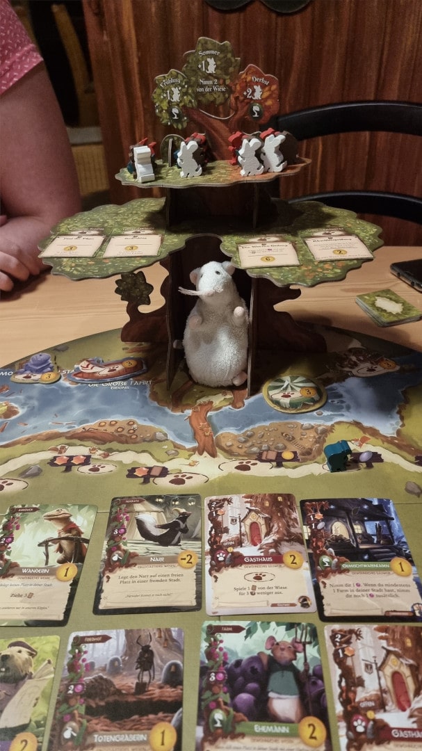 Die Anzahl von Aktionsmöglichkeiten ist übersichtlich. Zum einen können die Tiere auf unterschiedliche Rohstoffquellen eingesetzt werden (1), Handkarten können mit den Rohstoffen bezahlt und in die Stadt gebaut werden (2). Stehen nicht mehr genügend Tiere, Rohstoffe und/oder Handkarten zur Verfügung wird es Zeit die Jahreszeit zu wechseln. Bei diesem "Passen" werden die Tiere wieder vom Spielbrett zurückgenommen und je nach neuer Jahreszeit gibt es auch einen Bonus (3). Am Ende des Herbsts wird überprüft, welcher Spieler beim Städtebau und der Besiedlung durch Einwohner am erfolgreichsten war.